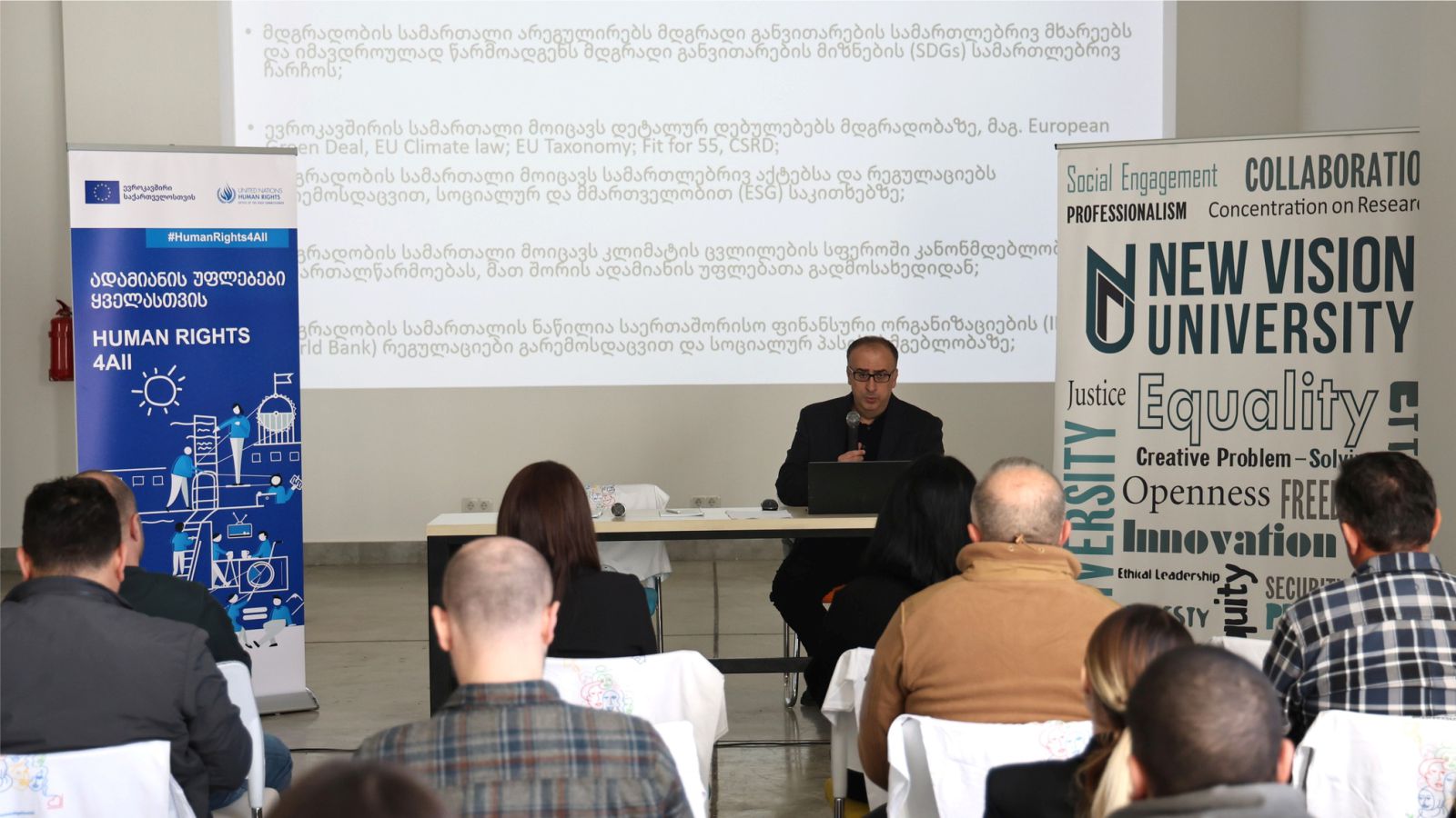 ადამიანის უფლებათა კვირეულის ფარგლებში ნიუ ვიჟენ უნივერსიტეტმა, ევროკავშირის და გაეროს ადამიანის უფლებათა უმაღლესი კომისრის ოფისის მხარდაჭერით, უმასპინძლა საჯარო ლექციას თემაზე - მდგრადობის სამართალი.